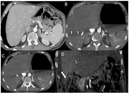 Pre-surgical (A) and first day after thoracic surgery (B,C) CECT axial images in a 65-year-old man with acute septic shock. (A) The portal image shows normal splenic volume and enhancement, physiologic size and enhancement of adrenals and a little sub-capsular angioma in the left liver. (B) Arterial phase image of emergent CECT shows splenic volume contraction and hypoperfusion. A demarcation line between the dependent/enhancing and non-dependent/non-enhancing liver parenchyma is present (white arrows). Note hyper-enhancing adrenals and thin-walled luminal distended stomach. (C) The 85″ venous phase shows a persistent hypoenhanced liver, adrenals hyperenhancement and stomach parietogram. (D) In a 57-year-old man with decompensed liver cirrhosis and critical reduction in circulating plasma, CECT coronal reconstruction shows dense gallbladder mural enhancement without thickened walls (white arrow).