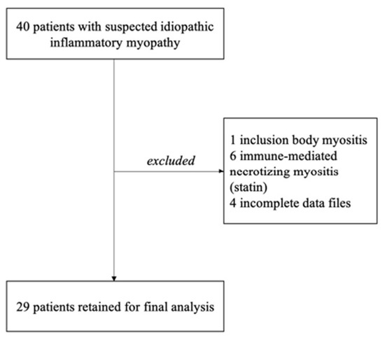 In total, 44 patients were identified to have idiopathic inflammatory myopathies (IIMs); among them, 29 patients were retained for the final analysis (Figure 1).