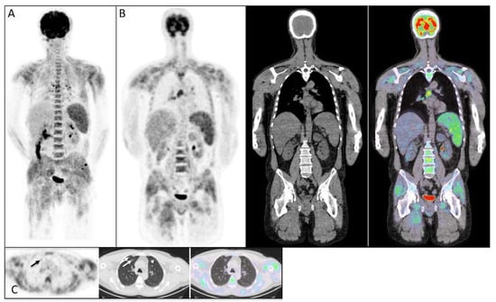 Figure 2. Maximum intensity projection (MIP) PET image (A) and coronal FDG-PET, CT, and fused PET/CT images (B) showing a heterogeneously increased muscular FDG uptake, multiple hypermetabolic mediastinal lymphadenopathies, and splenic hypermetabolism in a patient with dermatopolymyositis. (C) Transaxial FDG-PET, CT, and fused PET/CT images showing slightly hypermetabolic pulmonary nodular condensations (arrow) and non-hypermetabolic subpleural reticulations (arrowhead). Furthermore, heterogeneously increased muscle uptake is present in the context of dermatomyositis.