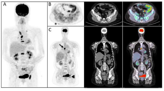 Figure 3. Maximum intensity projection (MIP) PET image (A), transaxial (B), and coronal (C) FDG-PET, CT, and fused PET/CT images demonstrating multiple hypermetabolic mediastinal lymphadenopathies (arrow) and bone lesions (arrowhead) in a patient with lung cancer. Furthermore, a slightly increased cutaneous FDG uptake was observed at the right lumbar region (asterisk). Cutaneous biopsies confirmed the diagnosis of dermatomyositis.