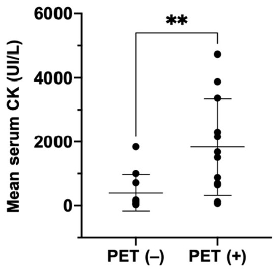 Figure 4. Comparison of mean CK values (UI/L) at diagnosis between PET-negative (no muscle uptake on PET/CT) and PET-positive (abnormal muscle uptake on PET/CT) IIM patients. ** p = 0.008.
