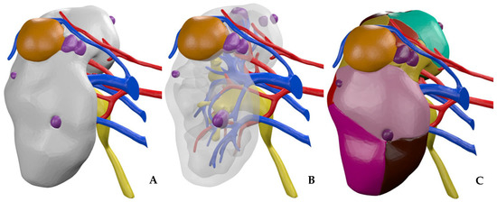 HA3D® virtual model. (A) Standard 3D virtual model. (B) Standard 3D virtual model with transparent parenchyma. (C) A 3D virtual perfusion model.