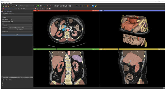 Renal parenchyma, aorta, and inferior vena cava were segmented using an automatic tool based on AI software. The TotalSegmentator tool [13] by 3D Slicer (https://www.slicer.org/, accessed on 7 June 2023) currently represents the gold standard in the artificial intelligence segmentation process.