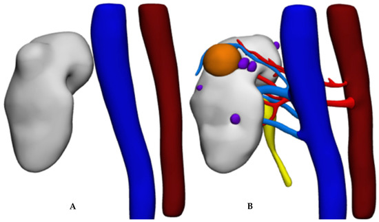 Renal arteries and veins, collecting system, tumors, and cysts were segmented through Mimics Medical 21.0 (Materialise, Leuven, Belgium) using automatic and manual segmentation techniques that use computer vision algorithms based on grayscale, according to the previous description, as the gold standard [12]. A part of the manual refining process is necessary to better define the contours of the anatomical parts and remove “noise pixels”. With good-quality images, it is possible to identify at least up to the third intraparenchymal branch, giving the model an outstanding level of accuracy.