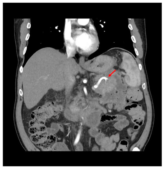View of recurrent collection at pre-operative CT-scan. Red arrow points to the splenic artery inside the collection.