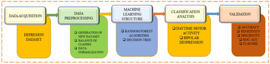 Figure 1 to identify and categorize bipolar depression. The first phase describes the data collection procedure from which the participants’ or patients’ motor activity records are gathered. Data pre-processing is involved in the second step, which is followed by the ML method with feature extraction and additional methods like random forest and decision tree. Beginning with daytime motor activity and bipolar depression, the categorization analysis method then starts. The various categorization models are assessed to complete the validation steps.