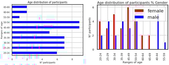 Figure 3, which displays the participants’ ages. Although the selection procedure was not skewed to utilize the age feature as the data processing, it is useful in data exploration. The participants (conditions and controls) range in age from 20 to 69 years old, with 30 females and 25 males. Higher N° participants are found in the participant age groups of 45 to 54.