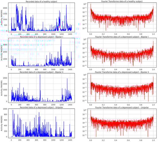 Figure 5 shows the activity logged over 24 h by participants in the control and condition groups, where blue and red activities are related to the recorded data of a healthy subject and the Fourier transform of a healthy subject, respectively. Here, data for bipolar I, bipolar II, and unipolar are all compiled.