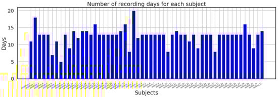 In addition, the dataset made available to the public was split into two directories: one folder contains recordings from the control group along with date, timestamps, and activity measures for each participant in a CSV file; the second directory contains recordings from the condition group with the same parameters as the control group; and lastly, the dataset also includes a score. The above-mentioned participants’ data are contained in the CSV file. The majority of the recordings were recorded over a period of 13 days; however, others took longer or shorter.