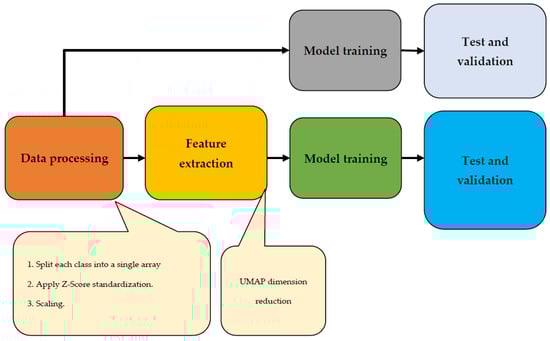 Figure 7. Following the initial data processing step, the feature extraction process took place. Subsequently, the data underwent testing, training, and validation phases. To ensure accurate results and facilitate comparison, two trials for this image were planned: one with UMAP dimension reduction and one without.