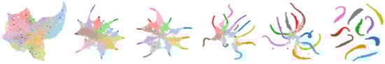 Figure 8, which shows multidimensional data transformed using the UMAP technique. UMAP assumes that the available data samples are evenly (uniformly) distributed across a topological space (manifold), which can be approximated from these finite data samples and mapped (projected) to a lower-dimensional space.