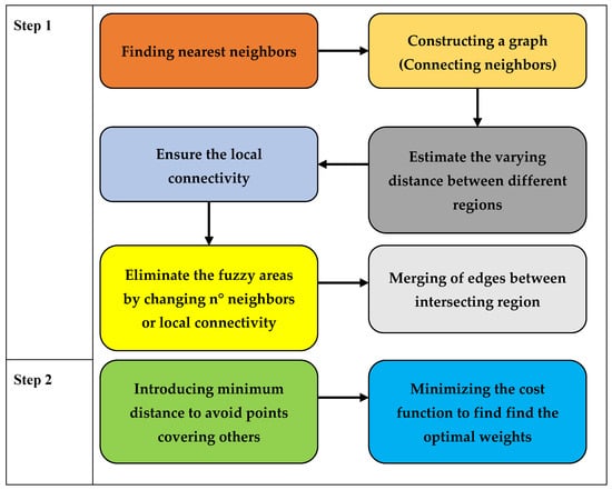 Figure 9 illustrates the UMAP approach schematized. Above it, the first step involves finding the closest neighbors by building a graph, estimating the varying distance between various regions while maintaining local connectivity, removing the fuzzy areas by changing the n-degree neighbors, and merging the edges between intersecting regions to complete the step. Additionally, the UMAP approach does away with the minimum distance in step 2 to prevent points from converging. To determine the ideal weights, it finally minimized the cost function [