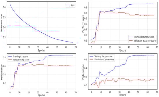 Using the unprocessed data, the first experiment was run (not the extracted features with UMAP). Due to the implementation of the Adam optimizer, which ends training once the network approaches the local minimum and leaves no room for improvement, fewer than 70 of the 100 epochs of the model’s training were completed. The cross-entropy loss decreased and almost reached 0.2, but the validation score performed poorly in comparison to the training score, passing 0.8 in accuracy and F1 score, whereas the validation score remained around 0.6, and the Cohen Kappa score did not even pass 0.1 in the validation set, due to the imbalance in the class distribution, as shown in