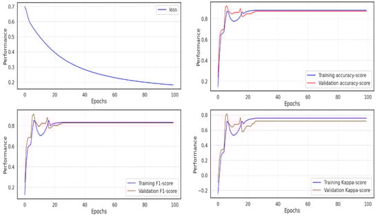 After applying dimensionality reduction, the data were randomly divided into three sets for training, testing, and validation. The training set comprised 70% of the data, the testing set contained 20%, and the remaining 10% was allocated for validation. This particular ratio is commonly employed by researchers to assess the performance of the proposed system. Cross-entropy was utilized as a loss function with the Adam optimizer for the classification model’s neural network, which included 52 parameters. Accuracy score, F1-score, and Cohen Kappa were used as metrics to assess the model’s performance.