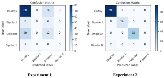 Figure 14, the confusion matrix for both studies showed that the healthy-labeled samples had the maximum presence, while the bipolar II samples had essentially no presence and the remaining classes were in the middle. This brings us back to the nature of the data source; as was previously demonstrated, there were only 14 samples in the bipolar II class, and only two samples were left in the testing set after the data had been divided among the training, testing, and validation sets. This has an impact on how well the network trains because with fewer samples, it is more difficult to identify the data, as seen in the left-bottom cell, where Bipolar II samples were mistaken for healthy samples. As seen in columns one and three of the confusion matrix, many samples in experiment 2 were incorrectly classified as “unipolar” or “healthy”, whereas in experiment 2, all classes except Bipolar II were correctly classified. This can be attributed to the size of both classes, which are larger than the other two classes (Bipolar I and Bipolar II).