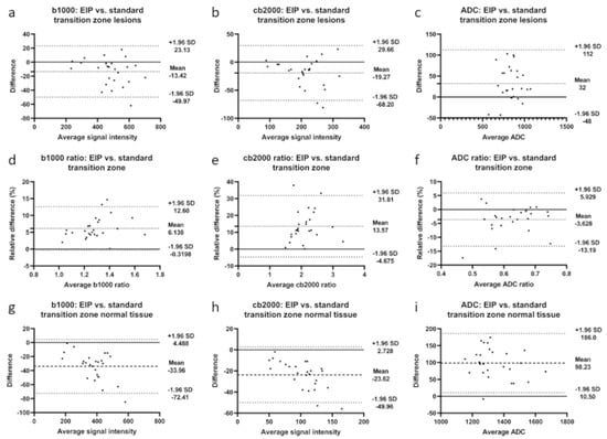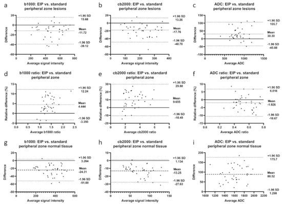 Correspondingly, quantitative assessment of lesion detectability also showed significant improvement: the median SI ratio increased by 3.8% from 1.31 to 1.36 in b1000 images (p < 0.001) and 11.6% from 2.75 to 3.07 in the cb2000 images (p < 0.001). The results of the quantitative analysis are presented in Table 1 and Table 2. In addition, Bland–Altman plots depicting the differences between standard and EIP images in lesion signal intensity and ADC values and the differences in SI and ADC ratios are presented in Figure 3.