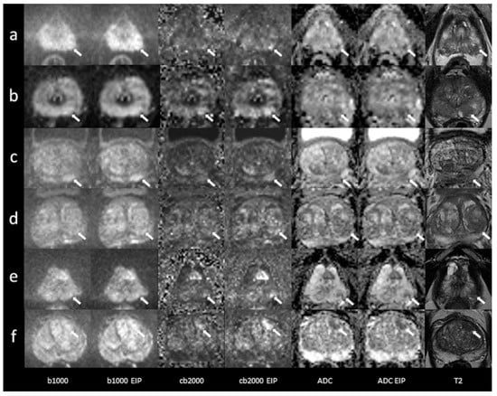 Imaging examples of six patients with peripheral and transition zone lesions were upgraded in the images using enhanced image processing (EIP). Comparison between standard images and images with EIP. (a): age, 76 years, PSA, 2 ng/mL. Lesion in the left posterolateral peripheral zone (PZ p) of the apex, measuring 7 mm. Standard images DWI score 3, EIP DWI score 4. Histology: adenocarcinoma, Gleason 7a. (b): age, 60 years, PSA, 4.2 ng/mL. Lesion in the left posteromedial peripheral zone (PZ m) of the apex, measuring 5 mm. Standard images DWI score 3, EIP DWI score 4. Histology: not available. (c): age, 74 years, PSA, 8.1 ng/mL. Lesion in the left posteromedial peripheral zone (PZ m) of the midportion, measuring 13 mm. Standard images DWI score 3, EIP DWI score 4. Histology: chronic prostatitis. (d): age, 54 years, PSA, 16.4 ng/mL. Lesion in the left posterolateral peripheral zone (PZ p) of the midportion, measuring 11 mm. Standard images DWI score 3, EIP DWI score 4. Histology: BPH. (e): age, 72 years, PSA, 13 ng/mL. Lesion in the left posterolateral peripheral zone (PZ p) of the apex, measuring 5 mm. Standard images DWI score 3, EIP DWI score 4. Histology: adenocarcinoma, Gleason 6. (f): age, 73 years, PSA, 10 ng/mL. Lesion in the left anterior transition zone (TZ a) of the apex, measuring 14 mm. Standard images DWI score 3, EIP DWI score 4. Histology: adenocarcinoma, Gleason 7b. The lesions are denoted by the arrows. b1000: trace-weighted images with a b-value of 1000 s/mm2; cb2000: computed high b-value images for a b-value of 2000 s/mm2; ADC: ADC map; T2: T2-weighted TSE images; EIP: enhanced image processing; BPH: benign prostatic hyperplasia.
