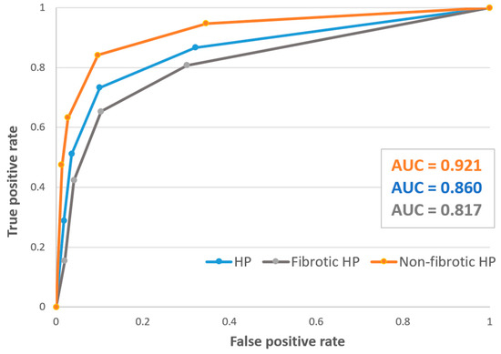The performance of the guidelines for each of their diagnostic confidence levels is shown in Table 1. The guidelines-based HP diagnosis with a threshold level of moderate confidence (≥70%) had a sensitivity of 73% (95% CI: 58–85%), specificity of 89% (95% CI: 84–94%), and the highest J-index of 0.62. Compared with the moderate confidence level as a threshold for HP diagnosis, the low confidence level showed a drop in specificity to 68% (95% CI: 60–75%), and the high confidence level showed a drop in sensitivity to 51% (95% CI: 36–66%). Overall, negative predictive values were high (84% to 95%) with variable positive predictive values (42% to 81%). The guidelines’ criteria had a higher sensitivity for non-fibrotic HP compared to fibrotic HP (84% vs. 65%) with similar specificity (89–90% for both). The area under the ROC curve (AUC) for a correct diagnosis by the guidelines was 0.86 (Figure 2, blue line).