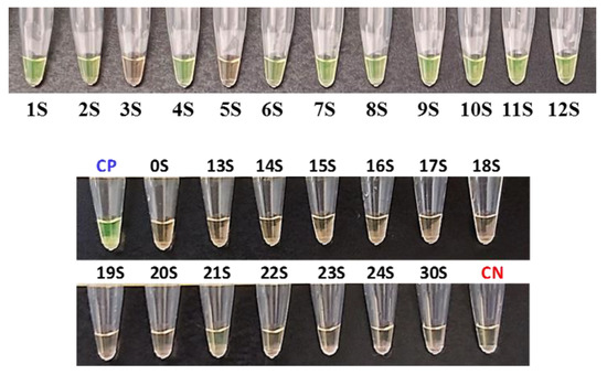 - Nawattanapaiboon, K.; Pasomsub, E.; Prombun, P.; Wongbunmak, A.; Jenjitwanich, A.; Mahasupachai, P.; Vetcho, P.; Chayrach, C.; Manatjaroenlap, N.; Samphaongern, C.; et al. Colorimetric reverse transcription loop-mediated isothermal amplification (RT-LAMP) as a visual diagnostic platform for the detection of the emerging coronavirus SARS-CoV-2. Analyst 2020, 146, 471–477. [Google Scholar] [CrossRef] [PubMed]