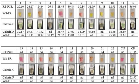 To verify the achievement of the new extraction-free WS-C, a comparative assay was performed using clinical saliva samples processed by RT-qPCR at the hospital. For this purpose, two commercial RT-LAMP based kits were compared to the developed WS-C: WarmStart Colorimetric RT-LAMP kit (WS-PR) and WarmStart Fluorescence LAMP/RT-LAMP kit (WS-F) with NEB primers. WS-C results were analysed simultaneously by fluorescence (Calcein-F) and colour change (Calcein-C). As shown in Figure 3, 12 saliva samples were positive with Ct values between 20 and 36 and 10 saliva samples were negative according to the results obtained with the referenced RT-qPCR method.