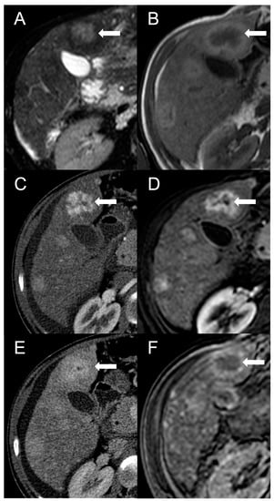 However, considering that approximately 25% of HCCs do not display washout in the portal and delayed phases, while up to one-third of FNH-like RNs can show it, the specificity of this feature for the diagnosis of HCC in BCS is relatively low. As reported by Van Wettere et al. [22], the association of homogeneous APHE and homogeneous washout was identified in one-third of benign lesions and in half of HCC cases. The resulting sensitivity and specificity for diagnosing HCC were 50% and 70%, respectively. When considering the combination of any type of APHE (homogeneous, peripheral or central) and any type of washout (homogeneous or peripheral), a sensitivity of 100% and a specificity of 61% were achieved. For this reason, given the risk of an unacceptable rate of false-positive results, the LI-RADS and AASLD/EASL criteria for the non-invasive diagnosis of HCC cannot be applied in BCS patients [28,29,30]. The differential diagnosis between FNH-like RNs and HCC becomes even more challenging due to the potential for the former to increase in size and/or in number. Therefore, it is important to consider additional features supportive of diagnosis of HCC, such as T1 hypointensity, hyperintensity in T2-weighted and high b-value DWI, and absence of a central scar on MRI [42], as shown in Figure 6.