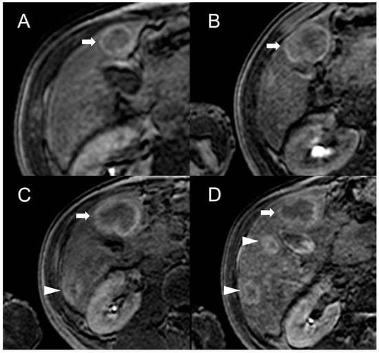 MRI examinations of a 31-year-old male patient with Budd-Chiari syndrome performed in 2016 (A), 2017 (B), 2018 (C), and 2020 (D). Gradient-echo T1-weighted sequences (flip angle = 30°) acquired in the hepatobiliary phase revealed a 25 mm FNH-like RN (arrows) with central scar and peripheral hyperintensity in 2016 (A). The lesion size grew to 41 mm after 1 year (B) and further to 44 mm after 2 years (C), but it reduced to 35 mm in 2020 (D). Additionally, new FNH-like RNs appeared over time (arrowheads in C,D).