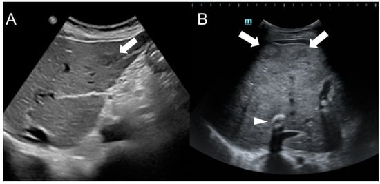 Ultrasound images of a 59-year-old female patient (A) and a 34-year-old male patient (B) with Budd-Chiari syndrome. In both cases, FNH-like RNs appear as hypoechoic lesions (arrows) within the heterogeneous liver parenchyma, occasionally exhibiting a central hyperechoic scar. A TIPS stent is visible in case B (arrowhead).