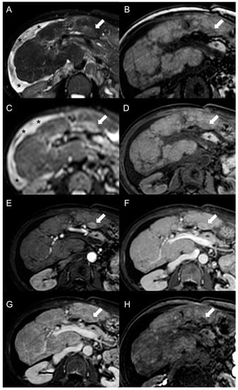 MRI examination of a 67-year-old female patient with Budd–Chiari syndrome reveals a new focal lesion of 13 mm in the left lobe (arrow). The lesion appears hyperintense on T2-weighted images (A), hypointense on T1-weighted images (B,D) and shows restricted diffusion in high-b-value DWI (C). After contrast agent administration, the lesion demonstrates marked enhancement on T1-weighted arterial phase images (E), followed by central washout with enhancing capsule on T1-weighted portal venous (F) and delayed (G) phases. On T1-weighted images in the hepatobiliary phase (H) the lesion shows a hypointense signal, suggesting a diagnosis of HCC. Perihepatic ascites (asterisks) can be observed on T2-weighted images (A) and DWI (C).