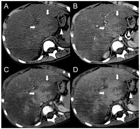 CT examination of a 5-year-old female patient with Budd–Chiari syndrome revealing a pseudo-lesion caused by hypertrophy of the caudate lobe. The caudate lobe (arrows) shows slight hyperdensity on unenhanced images (A), with heterogeneous contrast enhancement in the arterial (B), portal (C) and delayed phase (D). Notably, this represents a normal enhancement pattern due to preserved venous drainage, in contrast to the surrounding congested liver parenchyma. The hypertrophied caudate lobe also causes compression on the stomach (arrowheads), contributing to its mass-like appearance.