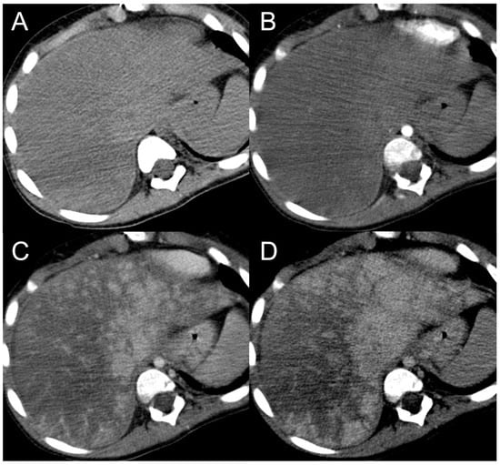CT examination of a 5-year-old female patient with Budd–Chiari syndrome. Unenhanced (A) and arterial phase (B) images show diffuse inhomogeneity of the liver parenchyma. In the portal phase (C) a patchy “mosaic pattern” enhancement is observed, with ill-defined nodular pseudo-lesions. In the delayed phase (D), these lesions tend to merge and disappear, indicating their perfusion-related nature.