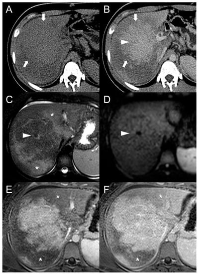 Perfusion-related pseudo-lesion in a 19-year-old male patient with acute Budd–Chiari syndrome. On the unenhanced (A) and portal venous phase (B) CT images a large mass-like alteration with irregular and ill-defined margins is appreciable in the central region of the right liver lobe (arrows). The thrombosed right hepatic vein (arrowhead) is also visible. On MRI, the fat-saturated T2-weighted imaging (C) demonstrates that the pseudo-lesion consists of normal liver tissue surrounded by congested hyperintense parenchyma (asterisks). On DWI (D), no areas of abnormal restriction are observed as well. Gradient-echo T1 weighted images in the portal (E) and hepatobiliary (F) phases confirm the perfusion-related nature of the pseudo-lesion, showing delayed and decreased enhancement in the congested areas (asterisks).