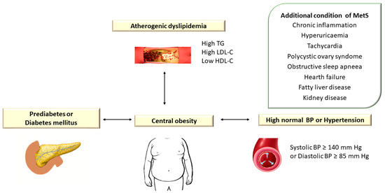 The National Cholesterol Education Program (NCEP) Adult Treatment Group III (ATP III) designated a group of metabolic (lipid and nonlipid) risk factors for cardiovascular disease (CVD). ATP III defined the MetS in the presence of more than 3 out of 5 clinical criteria, emphasizing the importance of insulin resistance and abdominal obesity in the etiology of MetS [2,95] (Figure 3).