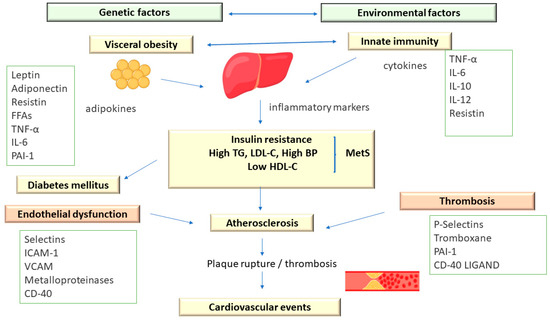 In addition, MetS is associated with a prothrombotic status, characterized by increases in both fibrinogen and plasminogen activator inhibitor-1 (increases in fibrinogen and plasminogen activator inhibitor-1) and proinflammatory, with increases in acute-phase reactants (C-reactive protein) [13].