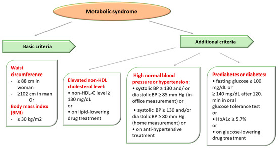 The diagnosis of MetS was established in the presence of obesity and two of three of the following criteria: high blood pressure (BP), impaired glucose metabolism, and elevated non-HDL-C level (atherogenic dyslipidemia) [2,95].