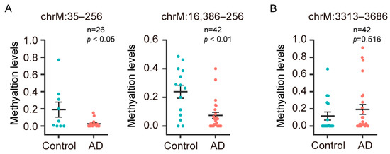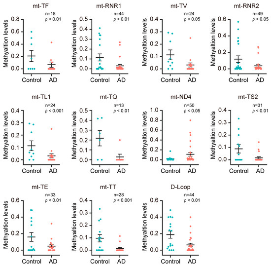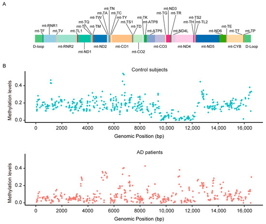 Mitochondria are essential organelles in cells that play an important role in pathogenesis of AD. These semi-autonomous organelles possess their own genome. Human mitochondrial DNA (mtDNA) is a double-stranded circular molecule comprising 16,569 bp and consists of both coding and non-coding regions. The coding region contains 37 genes that encode for 2 ribosomal RNAs (rRNAs), 22 transfer RNAs (tRNAs), and 13 proteins that are essential components of the respiratory chain. The non-coding region, known as the displacement loop or D-Loop, contains the mtDNA replication initiation site and transcription start site [2]. Various factors such as mtDNA mutations and deletions, abnormal morphology, disruption of calcium homeostasis, abnormal mitophagy, and impaired biogenesis can cause mitochondrial dysfunction, which can promote development of AD [3,4,5]. The mitochondrial cascade hypothesis of AD [6] proposes that genetic changes in mitochondrial genes resulting in impaired mitochondrial function are considered a primary mechanism of AD pathogenesis. Furthermore, previous studies have suggested that the innate immune system has a preponderant role in AD [7]. Innate immunity can be triggered by the non-methylated CpG sites of mtDNA [8,9]. Recent research has shown that epigenetic modifications of mitochondrial genes, which do not involve changes in the genetic sequence, may play a role in the development of neurodegenerative diseases [10]. However, it remains unknown whether alterations in mtDNA methylation can be observed in AD patients, and the correlation between mitochondrial DNA methylation changes and AD remains unclear. Therefore, analyzing the methylation features of mtDNA can provide valuable insights for a better understanding of the pathogenesis of AD.