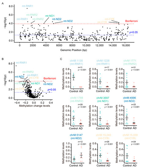 DMCs were predominantly hypermethylated in mt-CYB, mt-RNR1, and mt-RNR2 in plasma cfDNA of AD patients. (A) The scatter plot shows the −log p values obtained from the analysis of a GML performed on each CpG site in the mitochondrial genome, comparing AD patients (n = 31) and control subjects (n = 26). Red dashed line denotes the Bonferroni significance, while blue dashed line denotes p < 0.05 in the lower panel. (B) Volcano plots of methylation changes plotted against −log p value differences between AD patients (n = 31) and control subjects (n = 26). Red dashed line denotes the Bonferroni significance, while blue dashed line denotes p < 0.05. (C) The methylation level of the nine DMCs that passed the Bonferroni correction.
