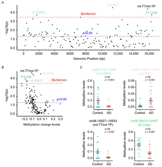 DMRs were predominantly hypomethylated in D-Loop, mt-RNR2, mt-TT/mt-TP in plasma cfDNA of AD patients. (A) The scatter plot shows the −log p values obtained from the analysis of a GML performed on each DMR in the mitochondrial genome, comparing AD patients (n = 31) and control subjects (n = 26). Red dashed line denotes the Bonferroni significance, while blue dashed line denotes p < 0.05 in the lower panel. (B) Volcano plots of methylation changes plotted against −log p value differences between AD patients (n = 31) and control subjects (n = 26). Red dashed line denotes the Bonferroni significance, while blue dashed line denotes p < 0.05. (C) The methylation level of the four DMRs that passed the Bonferroni correction.