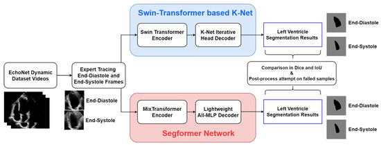 This section will elaborate on the two recent Transformer-based networks we experimented with in this paper. With the Transformer raised in the NLP field to modify the encoder–decoder structure initially [18], major followers of Transformer have been proposing modifications on their encoder–decoder networks [6,9,17] by embedding the Transformer module. Witnessing their high efficiency in segmentation tasks on universal datasets, like ImageNet and ADE20K, two encoder–decoder networks, Swin Transformer and K-Net and Segformer Network, are introduced to echocardiographic LV segmentation.