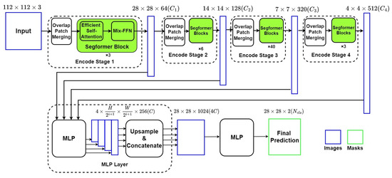 Figure 4 describes the framework of the Segformer network, which is also an encoder–decoder network with two main components: (1) a Mix Vision Transformer (MiT) which is a modified Vision Transformer based on Mix-FFN instead of positioning code; (2) a lightweight MLP decoder, which can integrate local and global attention with less computing complexity.
