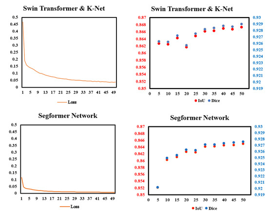 To check whether the models work properly, we monitored the loss in the training process and the IoU and Dice in every validation. Figure 5 shows data we monitored. In the training process, the improvements of loss was more significant in Swin Transformer and K-Net than in Segformer. In validation, the performances of Dice and IoU of the two models gradually became steady after 30 epochs of training. For both IoU and Dice scores, Swin Transformer and K-Net performs slightly better than Segformer in most validations.