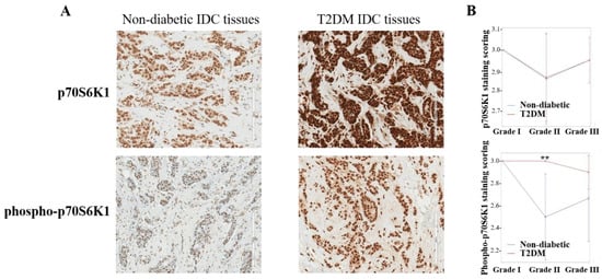 (A) Representative IHC staining of total p70S6K1 and phospho-p70S6K1 in grade II invasive ductal carcinoma (IDC) extracted from T2DM and non-diabetic patients showing a weak expression of phospho-p70S6K1 in non-diabetic IDC tissues while phospho-p70S6K1 was overexpressed in T2DM IDC tissues. Scale bar: 200 μm. (B) Scoring of phospho-p70S6K1 and p70S6K1 expression in IDC tissues based on the grade of the breast cancer tissues of T2DM and non-diabetic patients. ** p < 0.01 was obtained using ORTHOREG procedure from SAS system software (version 9.2, SAS Institute Inc., Cary, NC, USA) with post-hoc Tukey Honestly Significant Difference test.