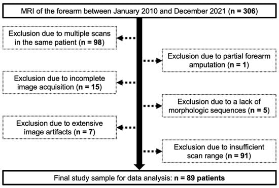 The local institutional review board approved this retrospective data analysis and waived the need for written informed consent (reference number: 20220818 01). Between January 2010 and December 2021, 306 consecutive MRI examinations of the forearm were available for radiological assessment. Of these, 217 had to be excluded from the data analysis for one of the following reasons: Multiple scans in the same patient (n = 98), partial forearm amputation (n = 1), incomplete image acquisition (n = 15), lack of morphologic T1- and/or T2-weighted sequences (n = 5), extensive image artifacts with resulting loss of diagnostic accessibility (n = 7) or insufficient scan range to evaluate the entire FDS anatomy (n = 91). Summarizing exclusions and inclusions, a flow chart illustrates the population analyzed in this study (Figure 1).