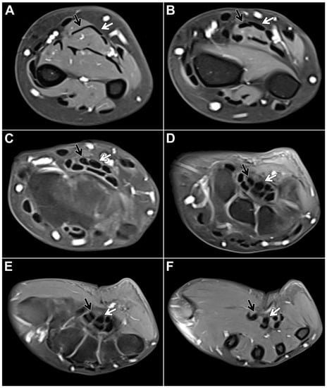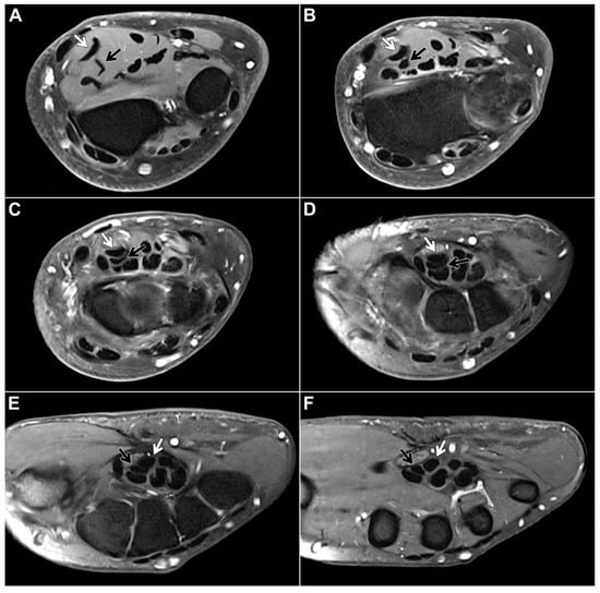 Fat-suppressed T1-weighted left forearm scan after intravenous administration of gadolinium-based contrast agent in a 48-year-old woman for presumed compression of the median nerve, which is located directly on the palmar side of the FDS tendons. Axial planes ((A,B): forearm level, (C–E): carpal tunnel level, (F): midcarpal level) depict the most common form of flexor digitorum superficialis anatomy: From the ulnar side of the forearm, the FDS/2 tendon (black arrow) crosses over the FDS/3 tendon (white arrow), thus forming the chiasma antebrachii.