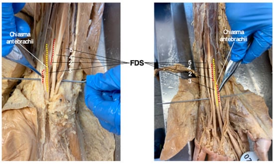 In all 11 human body donors assessed for this study, the chiasma antebrachii was present bilaterally in the distal portion of both forearms with the same anatomical configuration that was determined in the vast majority of MRI studies. Figure 4 shows the “standard” FDS tendon anatomy, including the chiasma antebrachii located in the distal portion of the forearm, in two cadaveric specimens (Figure 4).