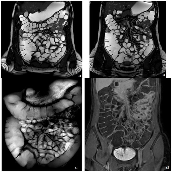 MRI was firstly introduced for bowel evaluation in the late 90s [1,2], when technology and software advanced to the point where it was possible to acquire images of the entire abdomen and bowel loops in breath-hold mode, using both T1- and T2-weighted sequences, with a sufficiently high spatial resolution. One of the main challenges in the MRI evaluation of the small intestine is still related to the intrinsic motility of the bowel, i.e., intestinal peristalsis, which causes motion artifacts, together with respiratory diaphragmatic movements. This problem can be partially resolved with antispasmodic drugs but, above all, with fast imaging acquisition. Breath-holding and fast imaging are both crucial for bowel evaluation, together with a good-to-high spatial resolution, high enough to assess the thin (2 mm) normal bowel wall, and together with a wide field of view, in order to assess the entire small and large bowel. Therefore, the combination of rapid imaging acquisition, high resolution, and wide field of view are three crucial requirements for a satisfactory evaluation of the bowel, but not easy to achieve simultaneously in a single examination, even using the most advanced MRI equipment (Figure 1).