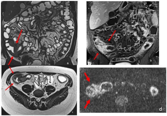 An eighteen-year-old patient with Crohn’s disease; the arrows point to the wall involvement of the last ileal loop and caecum with wall thickening, post-contrast enhancement, and restricted diffusion. (a) is a coronal TrueFISP image; (b) is a coronal contrast-enhanced T1 weighted image; and (c) is an AxialT2 W high-resolution BLADE image. (d) Axial DWI b800.