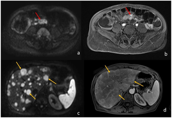 A 64-year-old woman with ileal NET and liver metastases. (a) (axial DWI b1000) and (b) (T1-weighted image post-Gadolinium injection) shows the ileal NET (pointed by the red arrows). (c) (axial DWI b1000) and (d) (T1-weighted image post-Gadolinium injection) show the multiple liver metastases (the yellow arrows point to the biggest three).