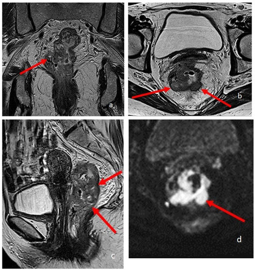 A 74-year-old patient with rectal cancer. (a–c) are T2-weighted high-resolution images in the coronal, sagittal, and axial planes, respectively. The arrows point to the pathological parietal thickening of the walls of the rectum. (d) is an Axial DWI b1000 image.