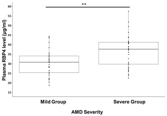 Plasma retinol binding protein 4 (RBP4) levels in the healthy/mild age-related macular degeneration (AMD) and severe AMD groups. ** p < 0.01.