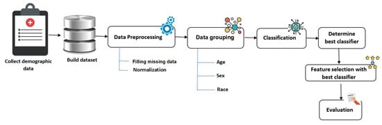Figure 1. The proposed methodology. The figure illustrates the step-by-step process of the proposed methodology, which involved five steps: data collection, data preprocessing, data grouping, classification, feature selection, and evaluation.